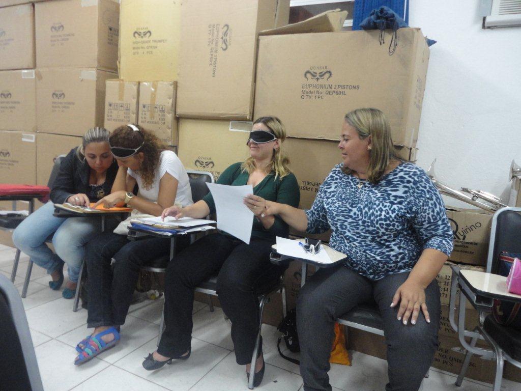 O grupo apresentou o "Modelo de Tomada de Decisão" em Braille para os alunos com deficiência visual (vendados). a leitura do texto foi feita oralmente por um facilitador/professor que estava apresentando a aula e todo o desenrolar aconteceu de forma dinâmica, com debates participativos de toda a turma. Foi possível verificar como se dá uma aula do PROERD de forma real, considerando a oportunidade de participação do aluno com deficiência visual junto com os demais alunos.